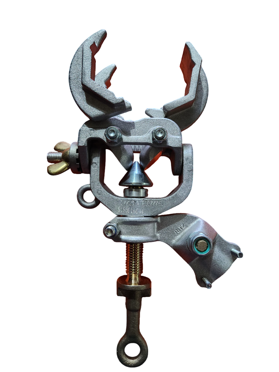 Grampo de aterramento para uso em linhas de transmissão e subestações de alta extra alta tensão, modelo multi-angular, corpo principal em bronze, mordente serrilhado em alumínio, parafuso de aperto tipo olhal, em bronze, conector dos cabos em bronze, para terminal liso, com travamento dos ângulos de operação, pré-ajustáveis e fixos através de porca borboleta, capacidade de conexão máxima 73mm, diâmetro, capacidade de corrente de curto de 30kA/30 ciclos, peso aprox. 2,60kg.