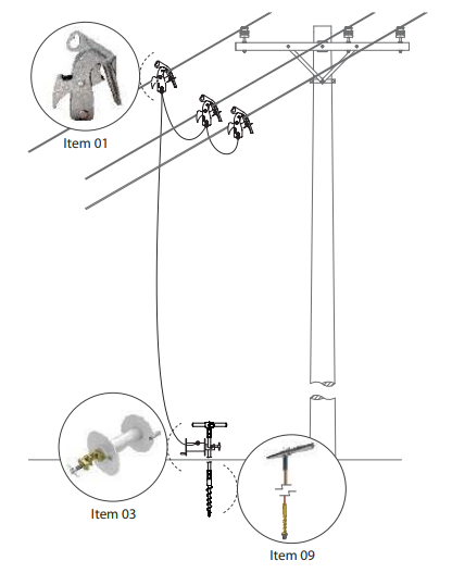 Conjunto composto por grampos de aterramento em liga de alumínio conectados aos condutores de cobre eletrolítico
