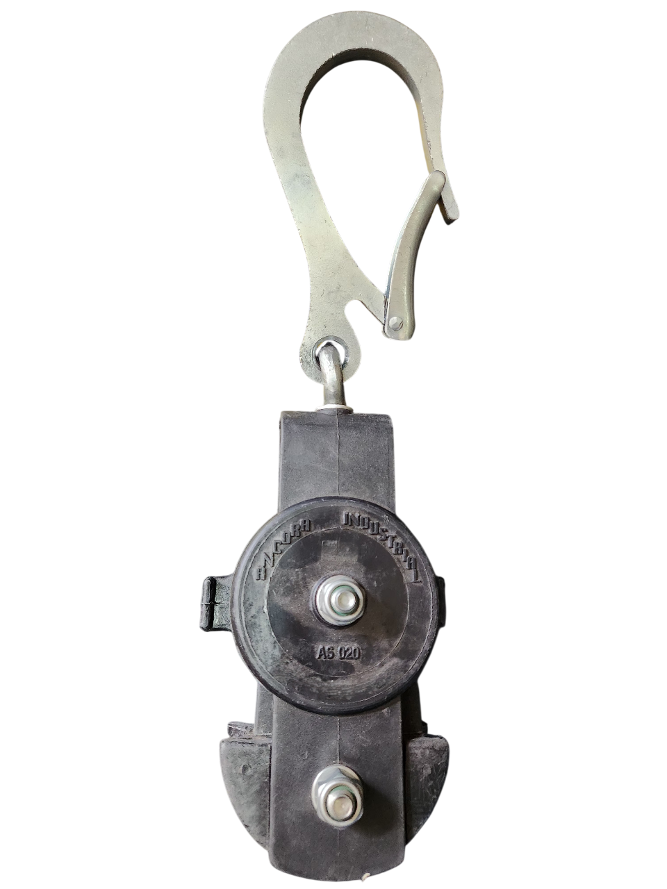 Materiais: Corpo e roldanas em polímero isolante de alta resistência, gancho em aço forjado, zincado eletroliticamente.