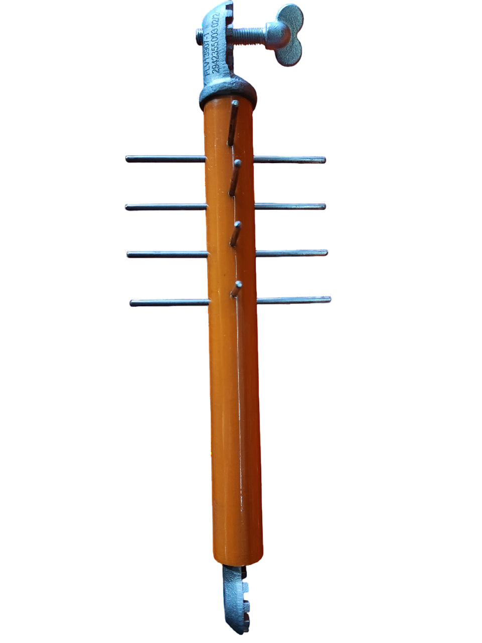 Construído com tubo RITZGLAS® Ø 25 mm x 0,30 m de comprimento total, possui pinos de aço transversais em seu corpo, com a finalidade de enlaçar os fios presos à rede elétrica.