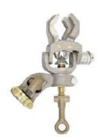 Grampo de aterramento multiangular em liga de alumínio, com parafuso olhal em liga de bronze, para uso em subestações e linhas de alta e extra-alta tensão, com mordentes serrilhados, conexão máxima de 954MCM CAA (ACSR) Ø 30mm de diâmetro, conexão mínima Ø 6,5mm de diâmetro, peso aprox. 1,85kg.
